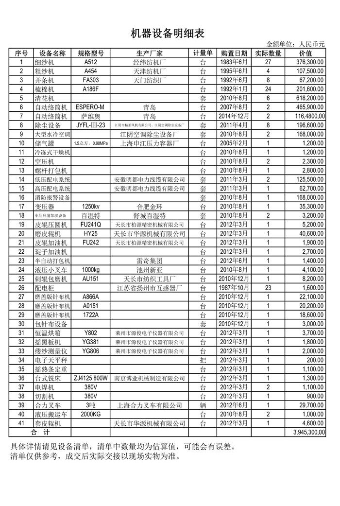 1、安徽澳得利紡織有限公司所屬的六土國用(2012)第9004號(hào)國有土地使用權(quán),土地面積53333㎡;有證房屋(辦公室、宿舍樓、倉庫、廠房),建筑面積25194.1㎡;無證房產(chǎn)附屬物、附屬物及園林綠化等,整體拍賣,參考價(jià)50483600元;
