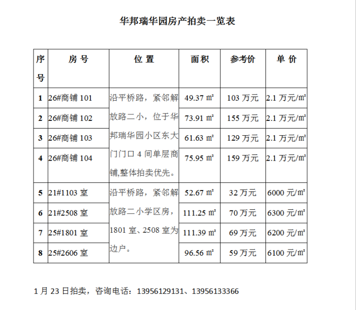 標(biāo)的2-8為解放路二小一墻之隔、華邦瑞華園小區(qū)學(xué)區(qū)房4套。華邦瑞華園小區(qū)緊鄰解放路二小、六安九中,位于平橋路與菜子河路交叉口繁華地段,附近有紫竹林農(nóng)貿(mào)市場(chǎng)、幼兒園、大型 商場(chǎng)、婦幼保健院等,交通便利,生活設(shè)施齊全,人流密集。是投資置業(yè)的好選擇。
