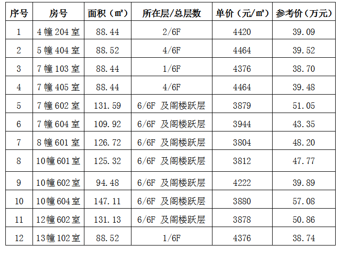 一、拍賣標(biāo)的:裕安區(qū)城南鎮(zhèn)振華藍泊灣12套住宅用房,單價3804元/㎡-4460元/㎡不等,具體見下表: