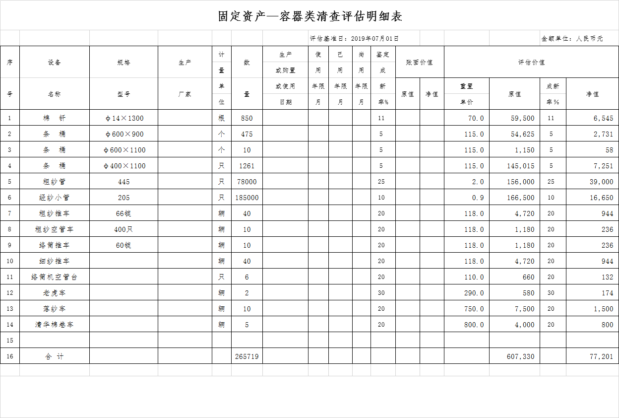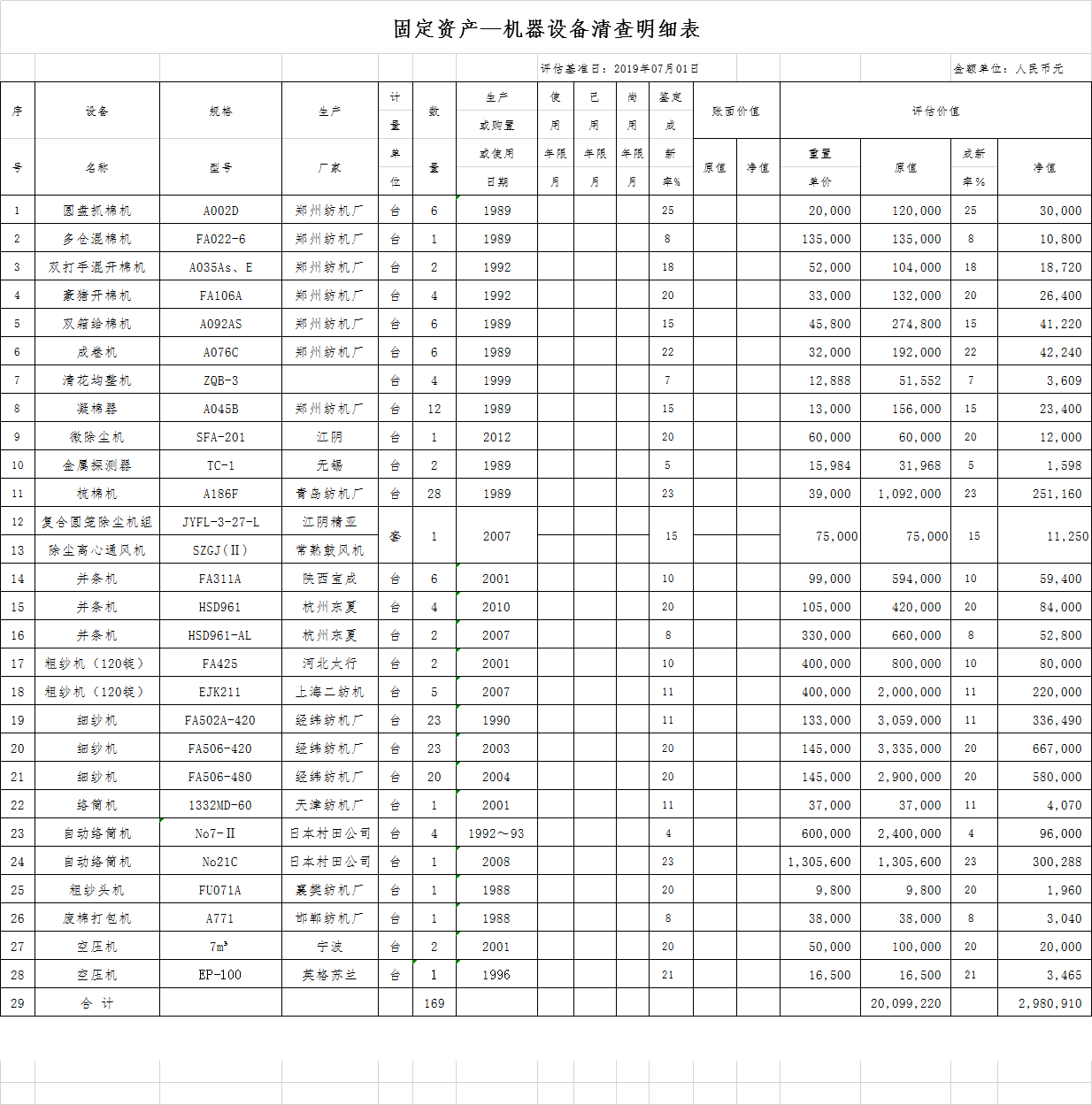 一、拍賣標(biāo)的:自動絡(luò)筒機(jī)、細(xì)紗機(jī)、粗紗機(jī)、梳棉機(jī)、并條機(jī)、成卷機(jī)、雙箱給棉機(jī)、圓盤抓棉機(jī)、豪豬開棉機(jī)、空壓機(jī)等二手紡織設(shè)備及輔機(jī)、容器一批。