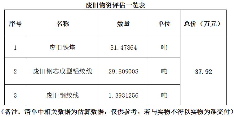一、拍賣標的:廢舊鋼芯成型鋁絞線、廢舊鐵塔、廢舊鋼絞線等廢舊物資一批。整體拍賣,參考價37.92萬元。