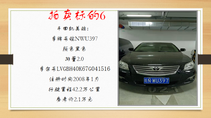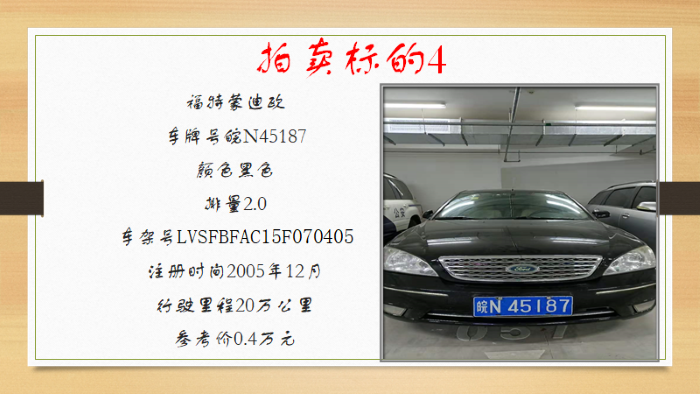 四、注意事項(xiàng):有意競買者請交納保證金1萬元/輛,交納保證金10萬元可拍全部車輛。賬戶:安徽邦德拍賣有限公司,開戶銀行:中國工商銀行股份有限公司六安南門支行,賬號:1314202409300068442。并于12月16日下午16時(shí)前在網(wǎng)上完成報(bào)名手續(xù),報(bào)名時(shí)需繳納報(bào)名費(fèi)200元,報(bào)名詳詢13956133366。競買不成,保證金5個(gè)工作日內(nèi)無息退還。