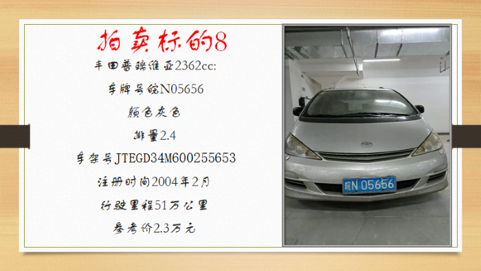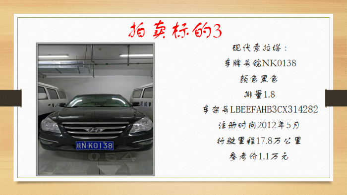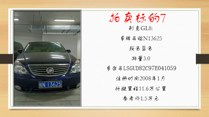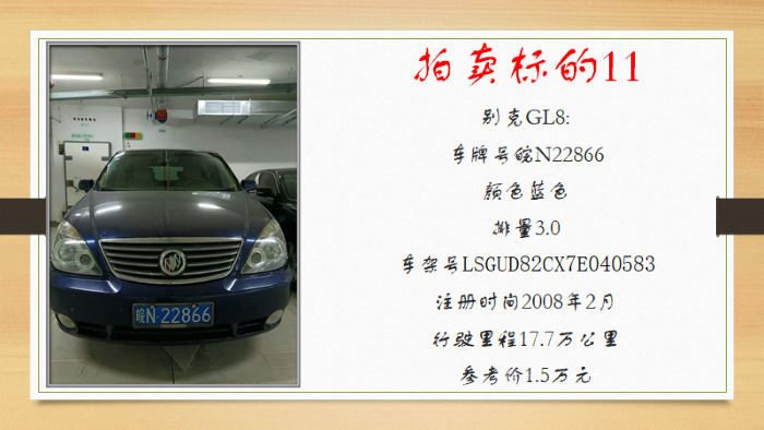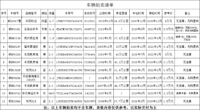 一、拍賣標(biāo)的:二手車11輛(車牌號為本次拍賣車輛的依據(jù),拍賣不含車輛號牌,詳見拍賣清單)。車輛以交付時(shí)的實(shí)際情況為準(zhǔn),參考價(jià):0.4萬元-6萬元/輛。