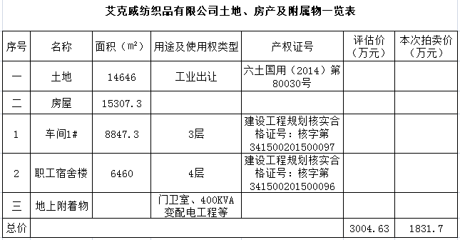 一、拍賣標的:位于六安市金安經(jīng)濟開發(fā)區(qū)鳳凰路與山源路交匯處六安艾克威紡織品有限公司所擁有的房產(chǎn)(約15307.3㎡)、工業(yè)土地(約14646㎡)、附屬物等,整體變賣,參考價1831.7萬元。