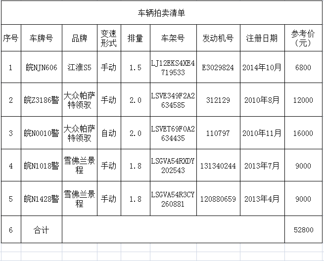 注:車輛按現(xiàn)狀移交,拍賣的所有車輛均不含車牌號(hào)。