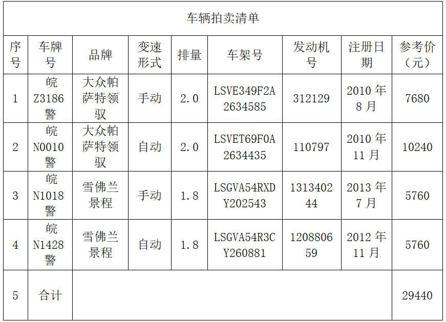 1、 皖Z3186警,皖N0010警,皖N1018警,皖N1428警二手車4輛,車輛詳情見下方清單。打包拍賣,整體參考價(jià)29440元。競拍保證金1萬元。