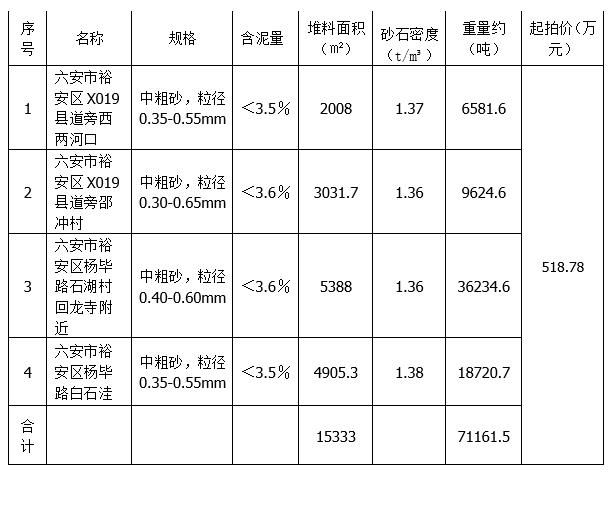 四處存量砂石整體打包拍賣,整體參考價518.78萬元。本次拍賣成交后不過磅。詳情見下方清單(清單中相關數(shù)據(jù)僅供參考,以實際看樣為準,以現(xiàn)場實物移交),拍賣標的品質、數(shù)量等數(shù)據(jù)僅供參考,如與實際有出入,不改變成交結果,不改變標的成交價款。