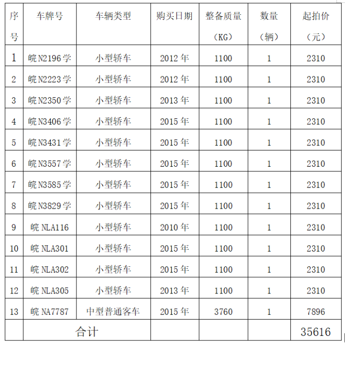 一、 拍賣標(biāo)的:報(bào)廢車輛13輛,打包拍賣,參考價(jià):3.5616萬元。競(jìng)拍保證金1萬元。標(biāo)的詳情見下方清單: