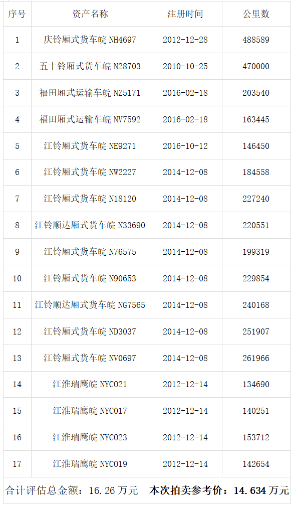一、拍賣標(biāo)的:慶鈴廂式貨車皖NH4697等二手車17輛,打包拍賣,整體參考價(jià)14.634萬(wàn)元。競(jìng)買保證金2萬(wàn)元。標(biāo)的詳情見(jiàn)下方清單: