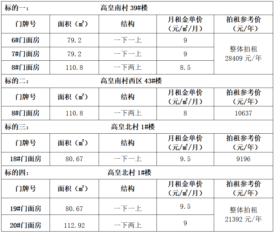 一、拍租標(biāo)的:六安市裕安區(qū)平橋工業(yè)園高皇南、北村安置小區(qū)部分門(mén)面房3年期租賃經(jīng)營(yíng)權(quán),標(biāo)的詳情見(jiàn)下表: