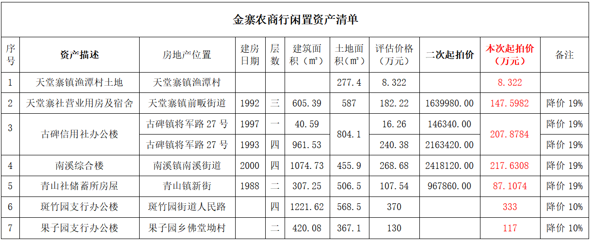 受委托,安徽邦德拍賣公司定于2023年7月28日上午10點在中拍平臺(https://paimai.caa123.org.cn/pages/meeting/conference.html?id=209415 )及金寨農(nóng)村商業(yè)銀行(紅軍大道與燕子河路交叉口)會議室舉行網(wǎng)絡(luò)與現(xiàn)場結(jié)合拍賣會,現(xiàn)公告如下: