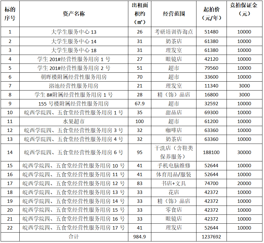 一、拍租標(biāo)的:皖西學(xué)院超市、理發(fā)室、眼鏡店、手機(jī)電腦維修、奶茶店、考研培訓(xùn)點(diǎn)等經(jīng)營性服務(wù)用房22處三年期租賃經(jīng)營權(quán),具體標(biāo)的詳情見下表: