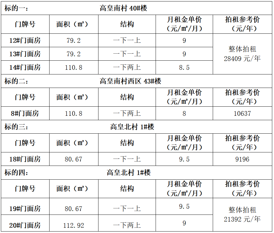 一、拍租標(biāo)的:六安市裕安區(qū)平橋工業(yè)園高皇南、北村安置小區(qū)部分門面房3年期租賃經(jīng)營(yíng)權(quán),標(biāo)的詳情見下表: