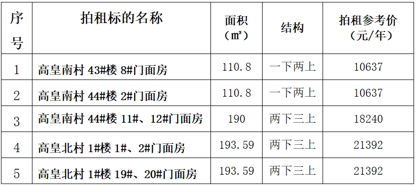 一、拍租標(biāo)的:六安市裕安區(qū)平橋工業(yè)園高皇南、北村安置小區(qū)部分門(mén)面房3年期租賃經(jīng)營(yíng)權(quán),標(biāo)的詳情見(jiàn)下表: