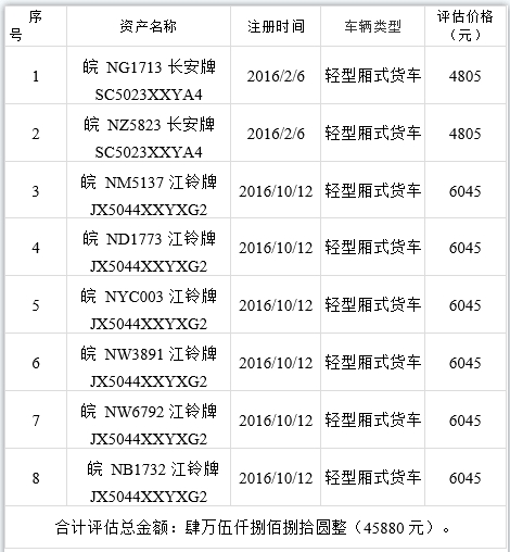一、拍賣標的:皖NG1713、皖NZ5823長安牌等二手車8輛,打包拍賣,整體參考價4.588萬元。競買保證金1萬元。標的詳情見下方清單: