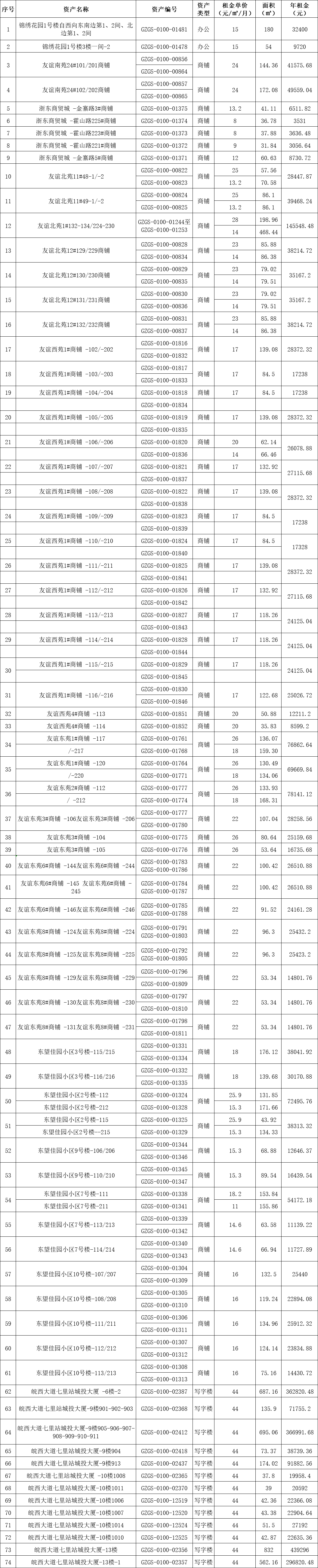 一、拍租標(biāo)的:六安市國資運營公司所擁有的錦繡花園、友誼東苑、友誼南苑、友誼西苑、友誼北苑、浙東商貿(mào)城、東望佳園小區(qū)、七里站城投大廈等74處商鋪、寫字樓、辦公用房5年期租賃經(jīng)營權(quán)。拍租標(biāo)的位置、面積、拍租起拍價等詳情見下方所附《拍租資產(chǎn)明細(xì)表》。競租保證金5000元/標(biāo)的。