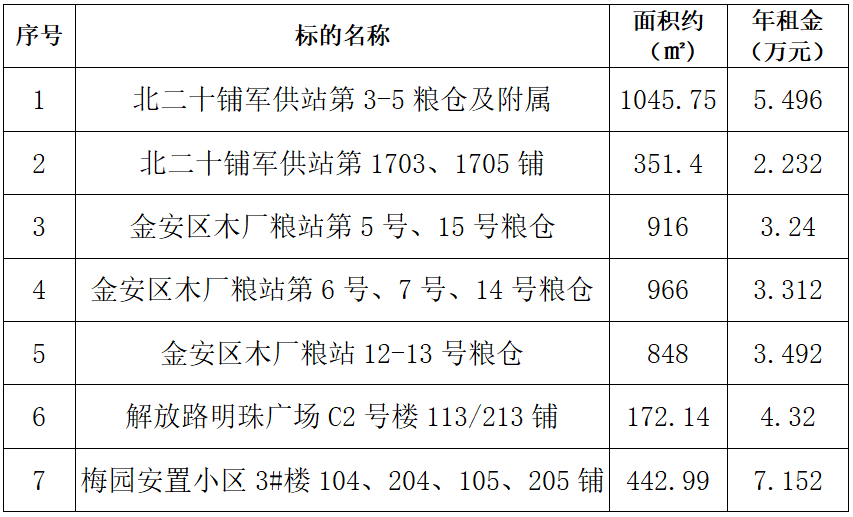 一、拍租標(biāo)的:六安市明珠廣場、梅園安置小區(qū)等商鋪及部分糧站糧倉3年期租賃經(jīng)營權(quán),標(biāo)的詳情見下表: