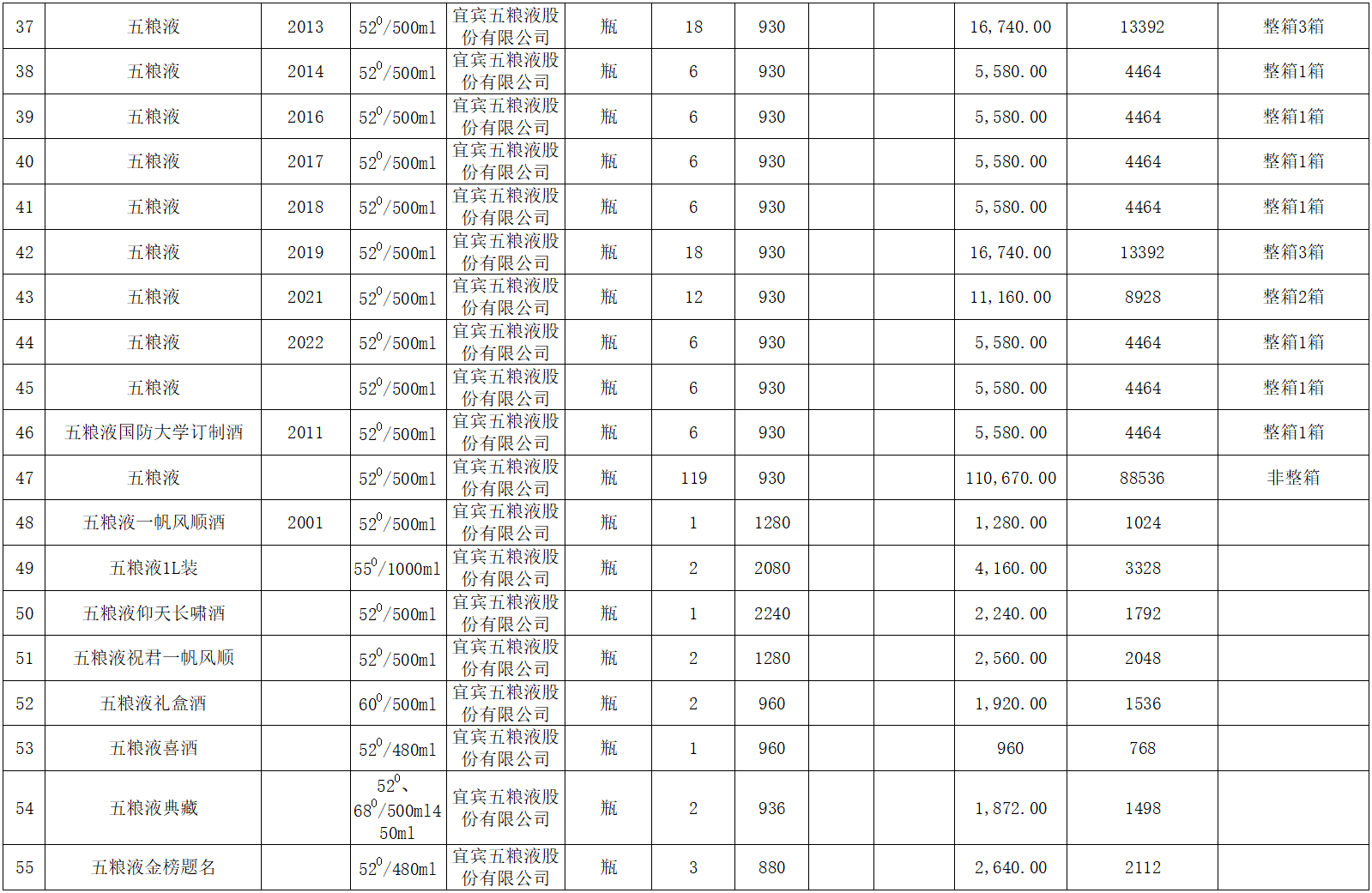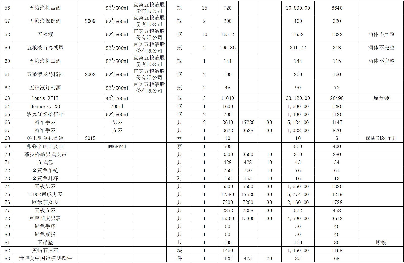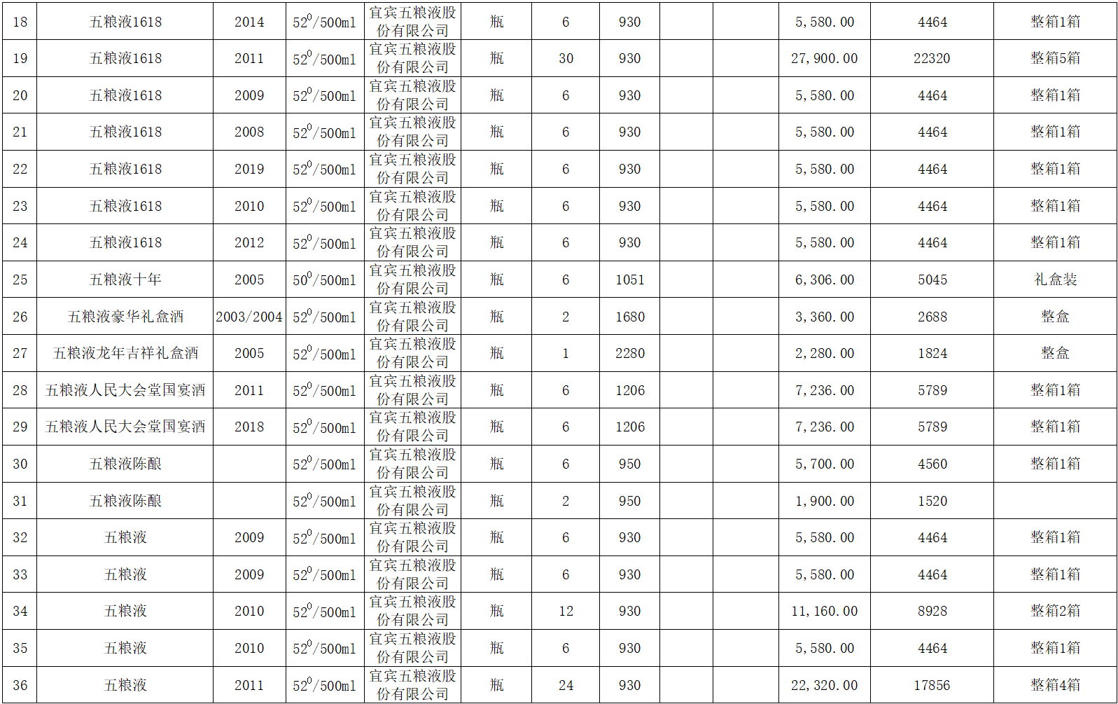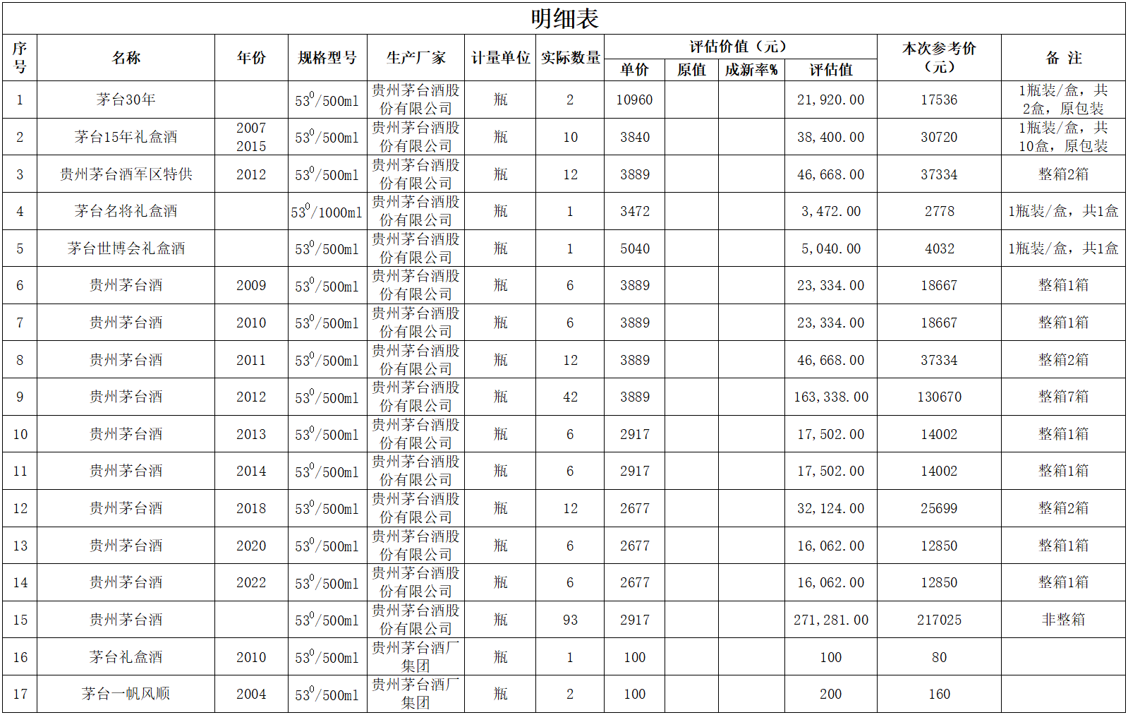 一、拍賣標的:貴州茅臺酒計224瓶、五糧液酒計406瓶及其他酒水、物品一批,整體打包拍賣,參考價:94.264萬元。競買保證金:10萬元。詳見下方明細表: