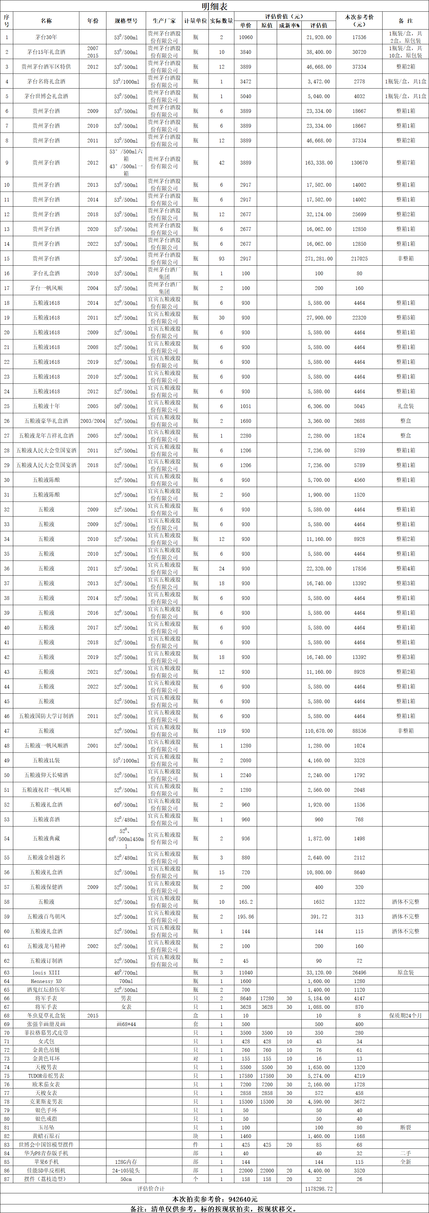 一、拍賣標(biāo)的:貴州茅臺酒計224瓶、五糧液酒計406瓶及其他酒水、物品一批,整體打包拍賣,參考價:94.264萬元。競買保證金:10萬元。詳見下方明細(xì)表: