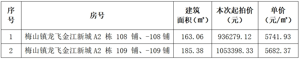 一、拍賣(mài)標(biāo)的:金寨縣梅山鎮(zhèn)龍飛金江新城商鋪,詳情見(jiàn)下方明細(xì)表。