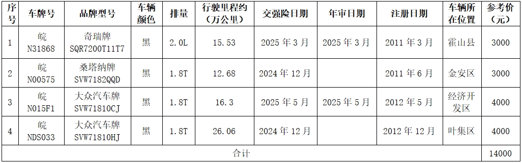 一、拍賣標(biāo)的:二手車4輛打包拍賣,詳情見下方清單,參考價(jià):1.4萬(wàn)元。保證金:1萬(wàn)元。