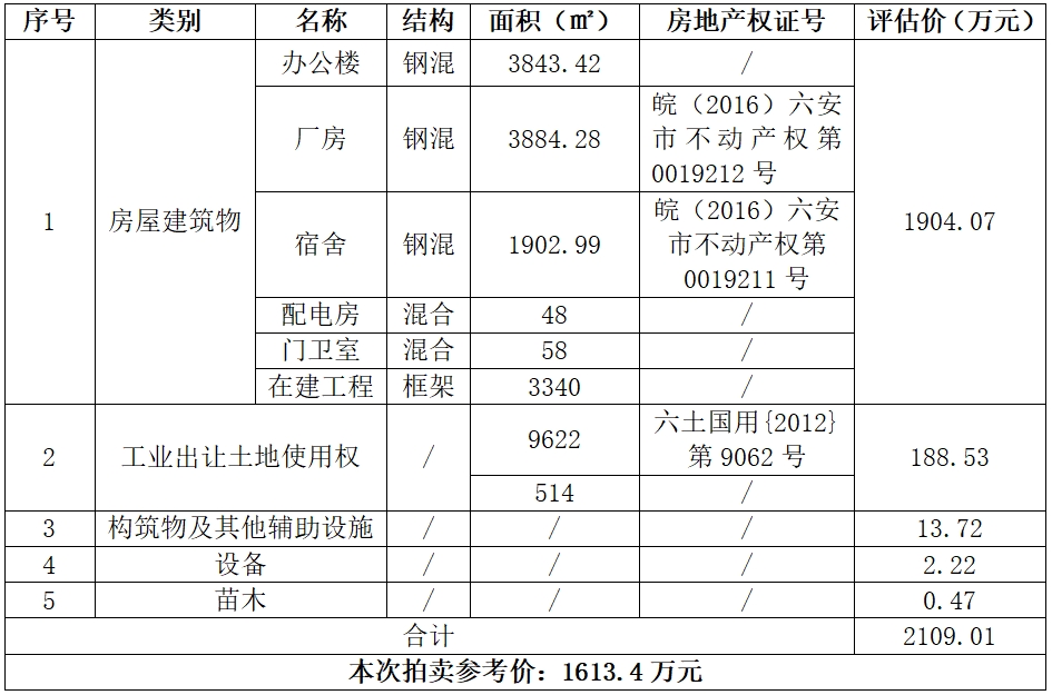 以上標的整體拍賣,參考價:1613.4萬元。現(xiàn)狀拍賣,現(xiàn)狀移交。保證金:150萬元。