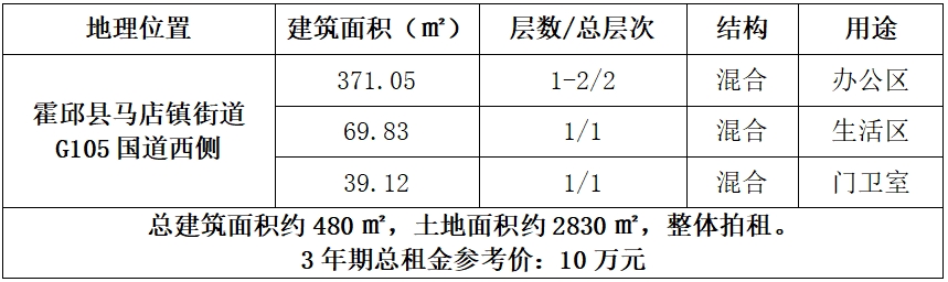 一、拍租標的:位于霍邱縣馬店鎮(zhèn)街道G105國道西側的霍邱縣公安局交通管理大隊馬店中隊辦公用房3年期租賃權,3年期總租金參考價:10萬元,成交后,競得人與委托方簽訂3年期房屋租賃合同。標的詳情見下表: