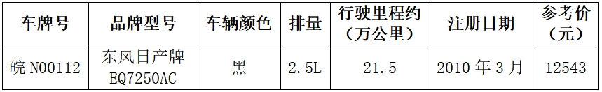 一、拍賣標(biāo)的:皖N00112尼桑天籟二手車一輛。參考價(jià):12543元,保證金:1萬元。詳見下方清單: