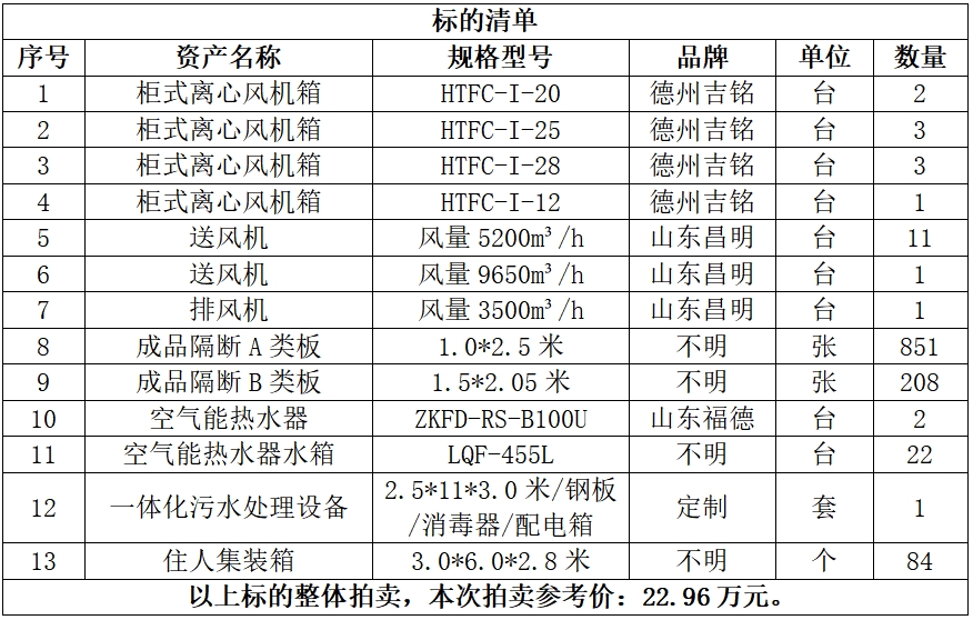 一、拍賣標(biāo)的:六安市中醫(yī)院閑置資產(chǎn)一批,包括:一體化污水處理設(shè)備、柜式離心風(fēng)機(jī)箱、空氣能熱水器、送風(fēng)機(jī)等,參考價(jià):22.96萬(wàn)元,競(jìng)買保證金:5萬(wàn)元。