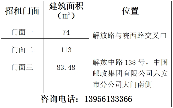 解放中路與皖西路交叉口國(guó)有沿街門面房三處,現(xiàn)對(duì)外招租,招租詳情如下: