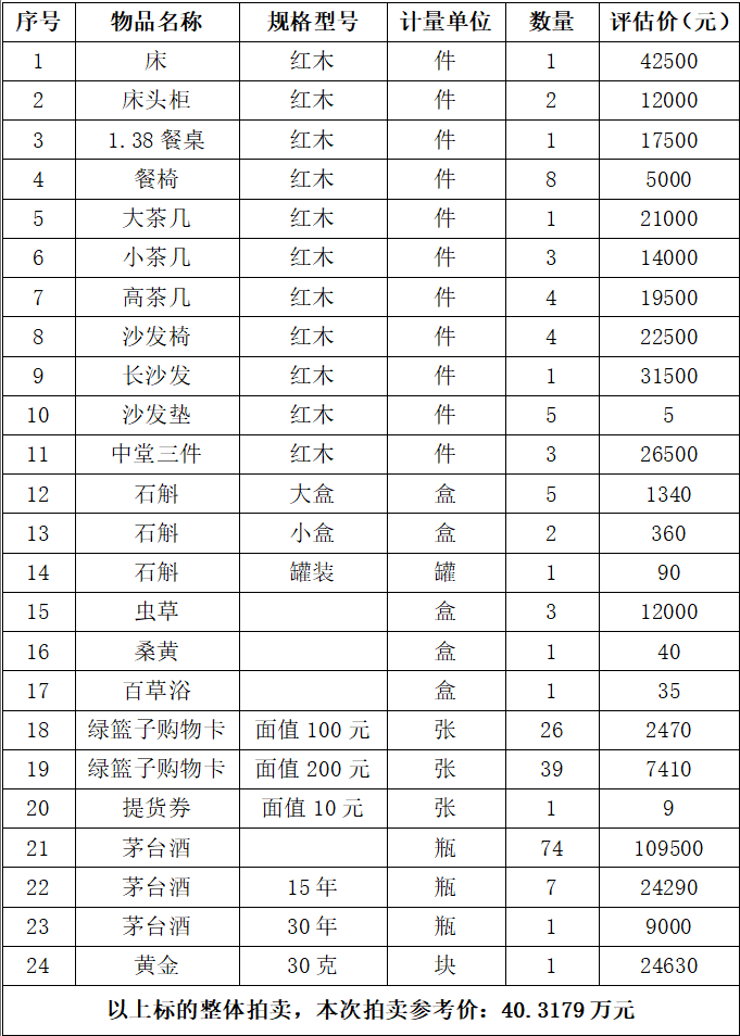一、拍賣標的:茅臺酒、黃金、家具等物品一批,整體打包拍賣,參考價:40.3179萬元。競買保證金:8萬元。詳見下方明細表: